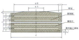圖中:δ-支座厚度;h-球冠高度;d-支座直徑;δ0-單層圓鋼板厚度;δ1-中間層橡膠片厚度;δ2-聚四氟乙烯厚度;其中ΦA≈1/3ΦB